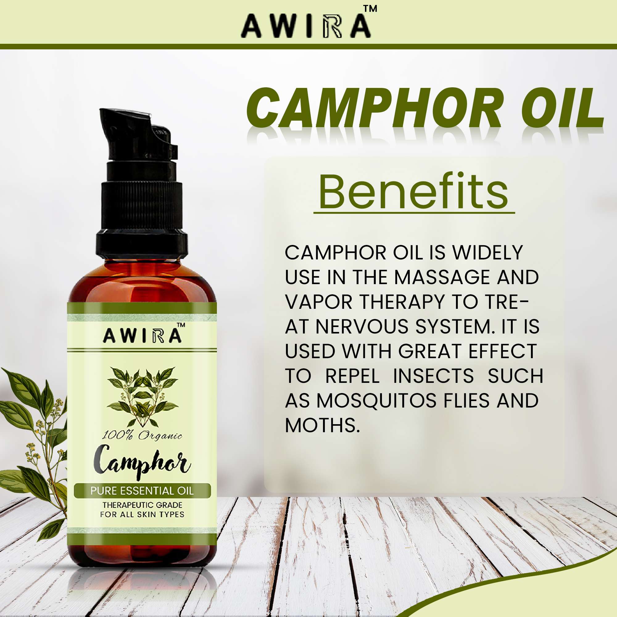 Awira Camphor oil is the oil extracted from the wood of camphor trees and processed by steam distillation. It can be used topically to relieve pain, irritation, and itching. Camphor is also used to relieve chest congestion and inflammatory conditions. It has a strong odor and taste and is easily absorbed through the skin.
