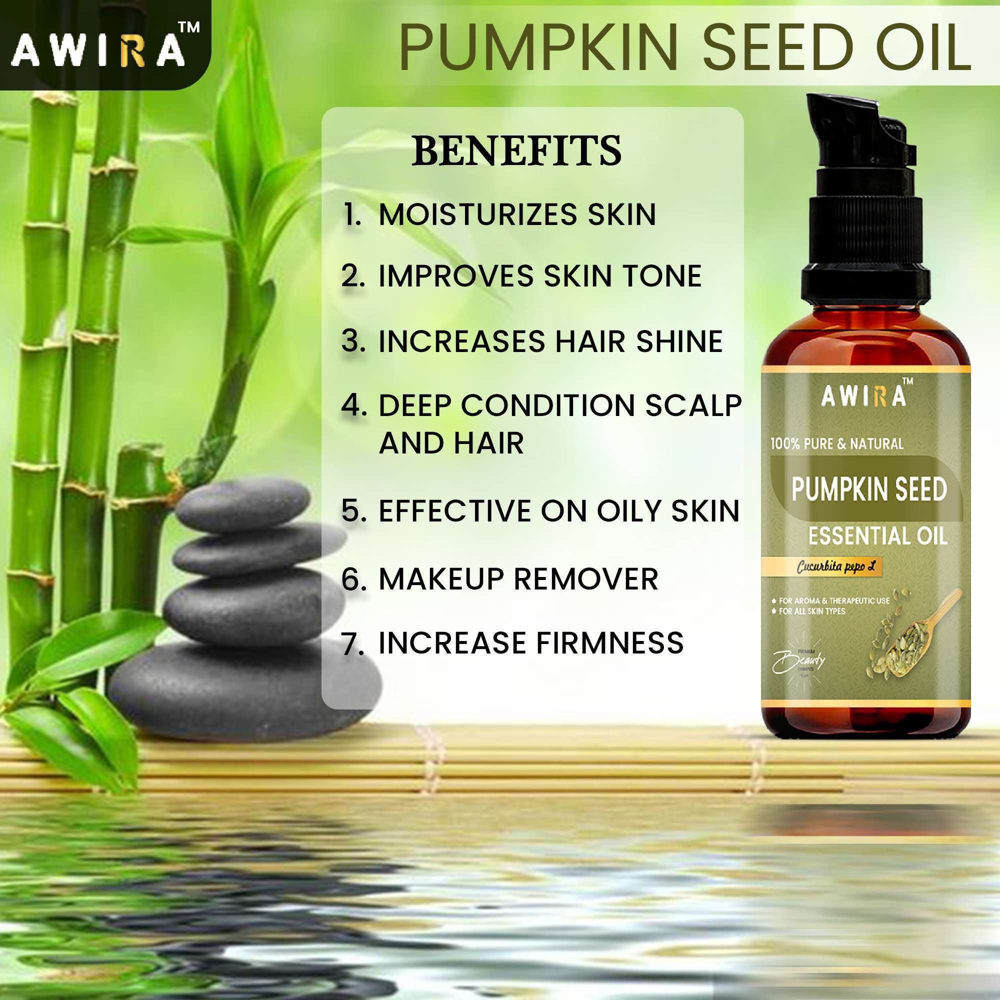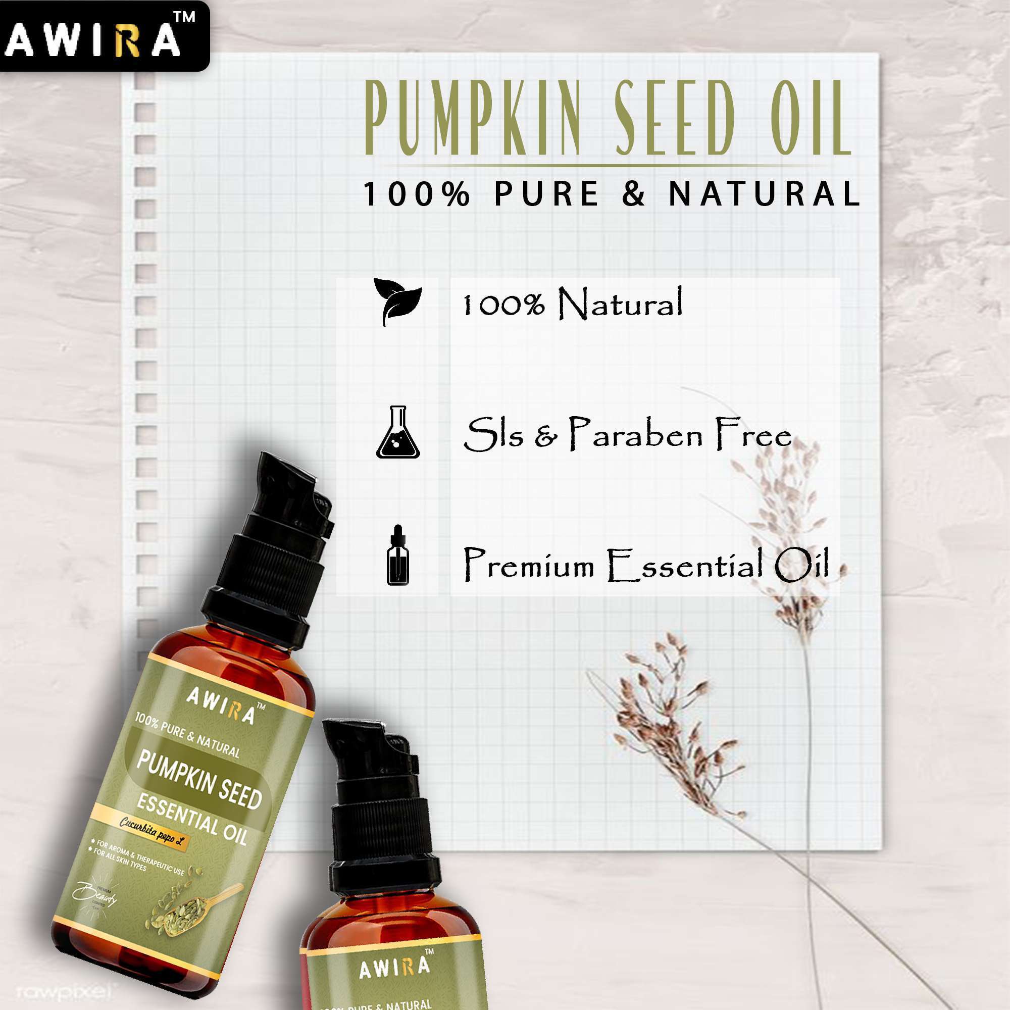 Awira Pumpkin Essential Oil for Hair Growth contains linoleic acid, fatty acid. It is used For Health Benefits, Female Hair loss, Hair Regrowth, Skin and Hair Benefits, Skin Care, Acne scars. The omega-6 fatty acids are crucial for normal growth and development and for brain function, and they help to stimulate hair and skin growth and maintain health. It is also a source of Phytosterols and Vitamin E.